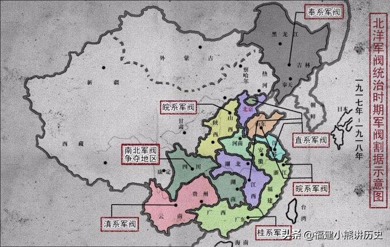 最后一个是奉系,指的是现在的东北。他的首领是张作霖。在这三个派系中,奉系是后期北洋军阀最强大的派系。在张作霖和日本人的影响下,他们成长了自己。因为日本人一直想占领东北,他们想培养张作霖为日本人服务,所以他们给张作霖送了很多武器和弹药,包括派军事顾问帮张作文训练奉军,所以奉军背后的靠山也是日本人。