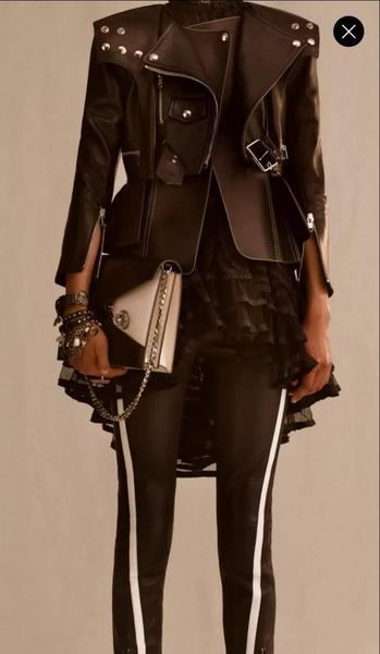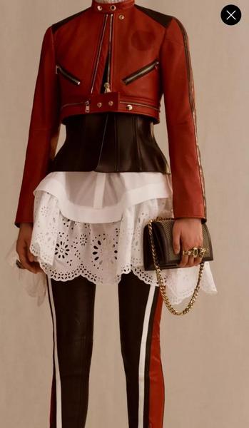 这张也是,短款机车夹克,腰下方露出花边下摆,裤装也是双色加彩条拉伸身高视觉,精美又时尚