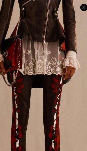 以上这张就是内衣花边外露的时尚穿搭,机车服,搭配修身,彩条图案裤,腰间露出花边蕾丝,最新时尚其中之一穿法