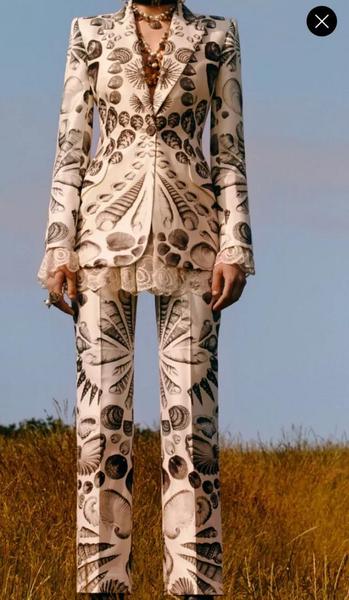 这张也是白色图案西服领套装,腰间的花边延露使这套服装淡化了西服领套装的严肃性,添加了柔美元素