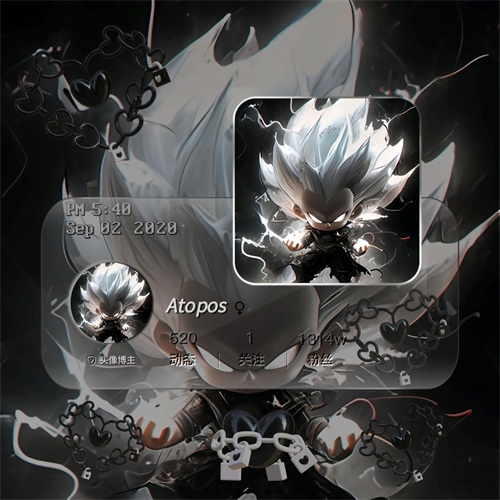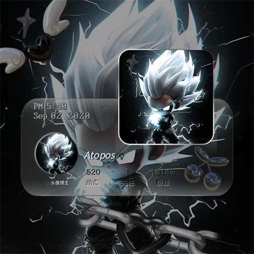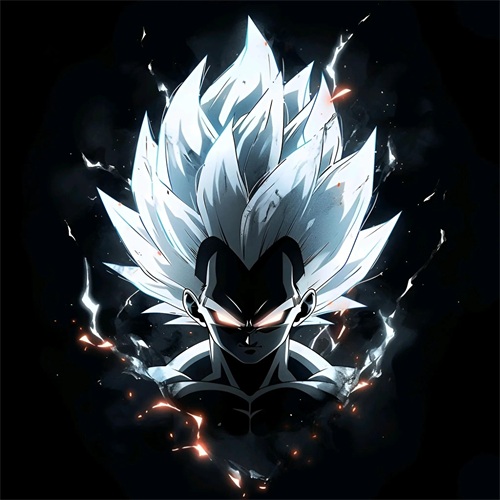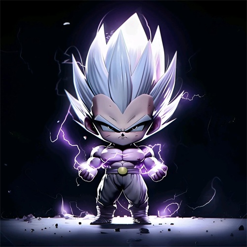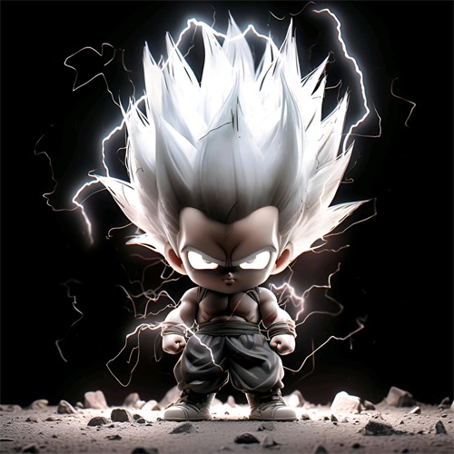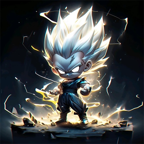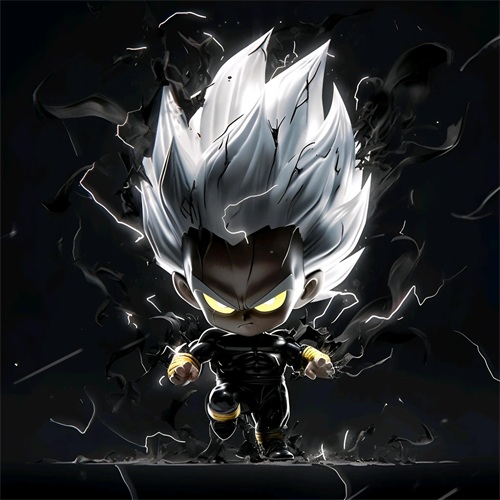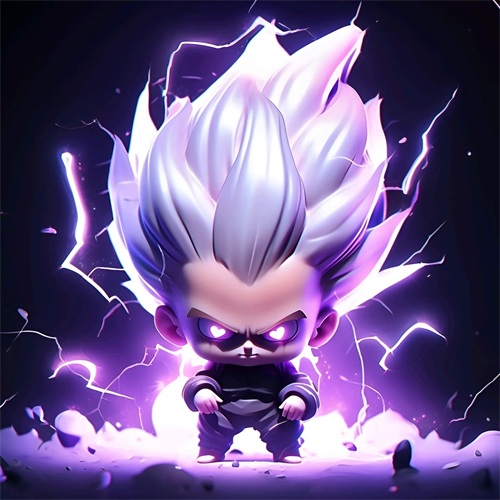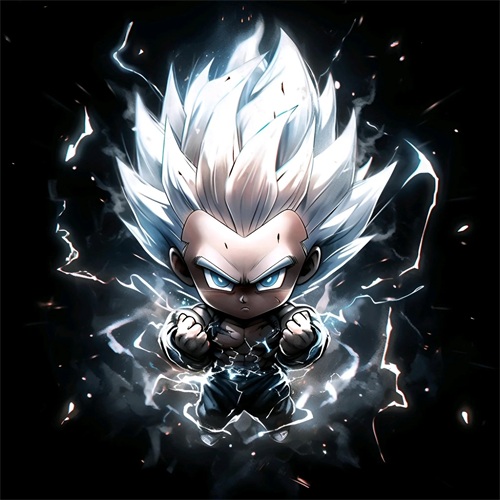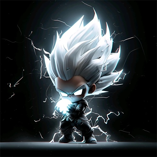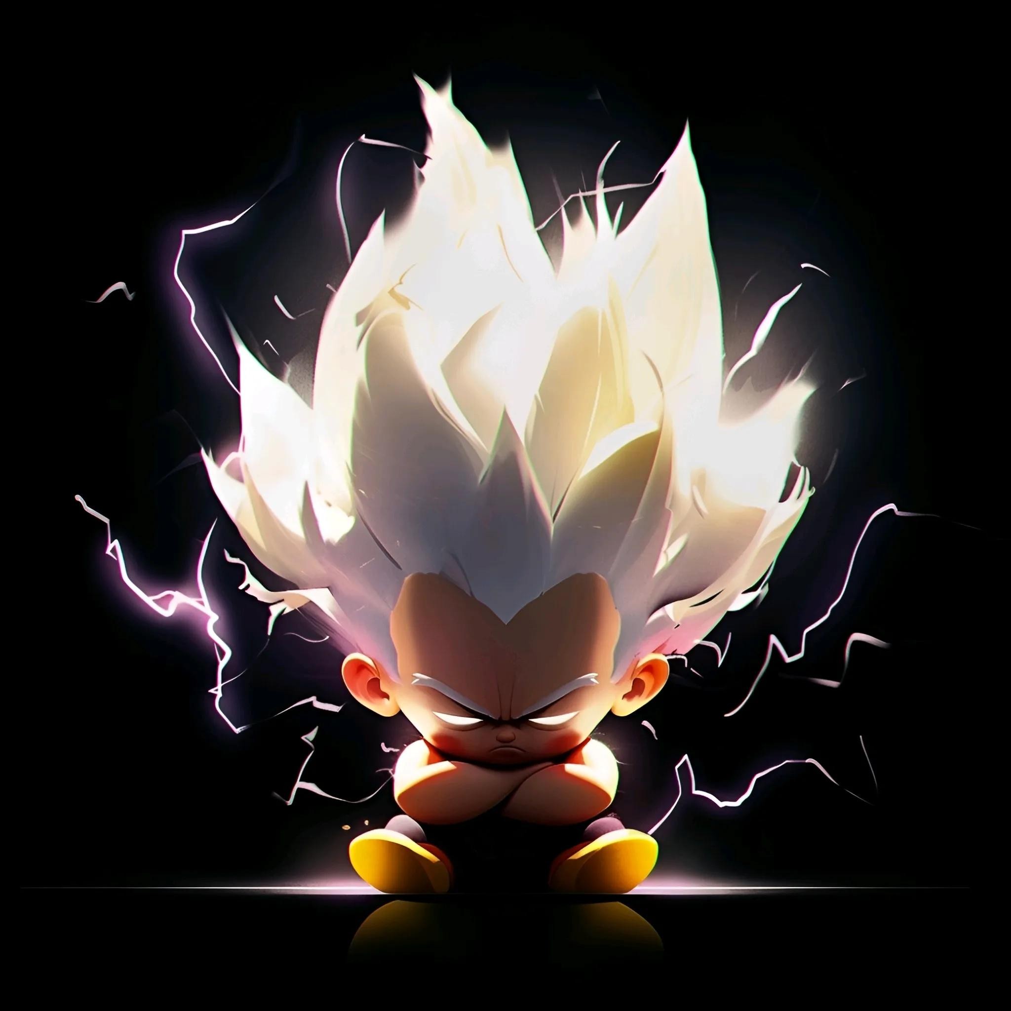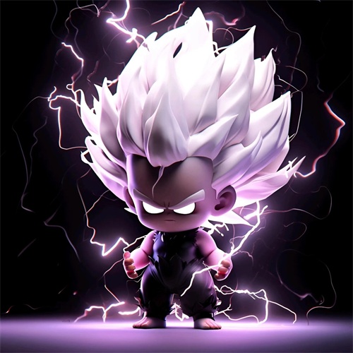 在一个黑暗的世界里,有一个超级无敌赛亚人,他的头非常大,是 Q 版的形象,看起来非常可爱。他的白色头发干净整齐,耳朵透明,身上穿着黑色的衣服,闪烁着闪电。