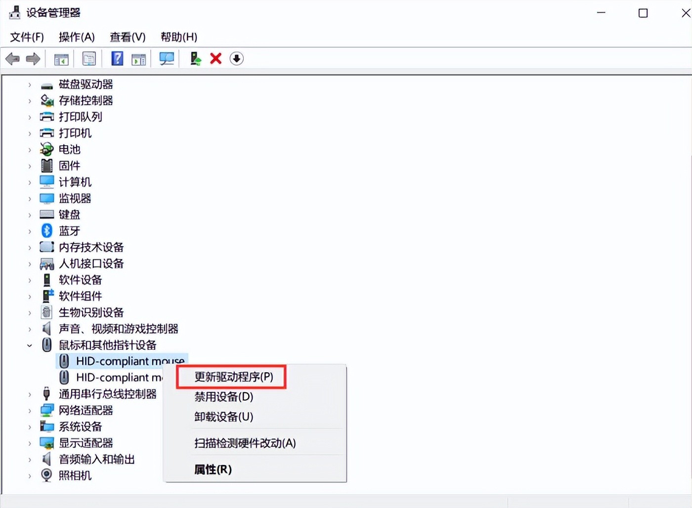 第二步:在设备管理器中,找到并展开“鼠标和其他指针设备”,右键单击触摸板,选择“更新驱动程序”。