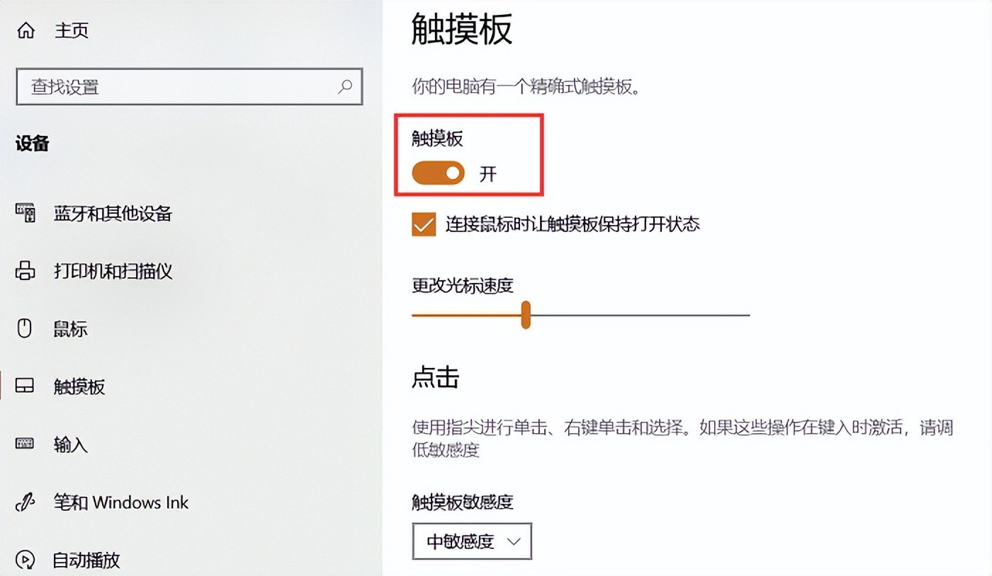 第二步:在触摸板页面中,确保您的触摸板是处于开启状态,您还可以在这里调整它的灵敏度。