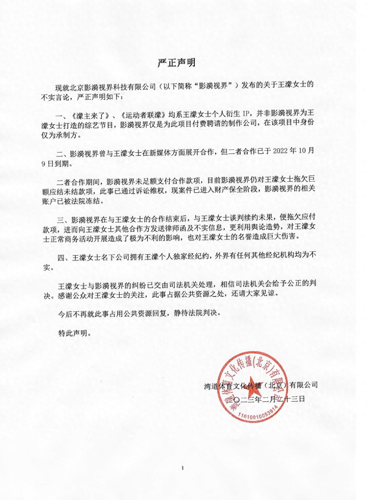 38岁的冬奥冠军王濛卷入一次经济纠纷,被曾合作过的北京影漪视界科技有限公司发声明起诉违约,后续王濛公开回应,态度强硬,明确说自己和这家公司的合作在2022年10月就已经结束,另外强调影漪视界科技有限公司拖欠自己巨额工资,公司账户被起诉到冻结。
