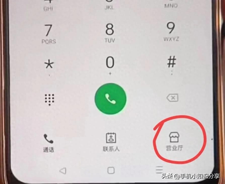 方法 1:打开打电话的界面,进入这个界面大家应该都很熟悉。但是,您有没有注意到,下方除了通话记录和联系人以外,在最右侧、右下角还有一个营业厅,我们点进去。(如上图所示)