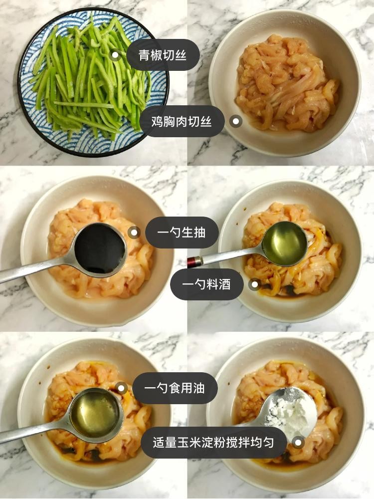 1.青椒切丝,鸡胸肉切丝放入大碗中加入一勺生抽+一勺料酒+一勺食用油+少许玉米淀粉搅拌均匀腌制10分钟;