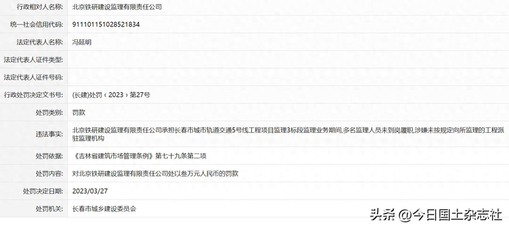 承担长春地铁5号线工程时多名监理人员未到岗履职!北京铁研建设监理被罚3万元
