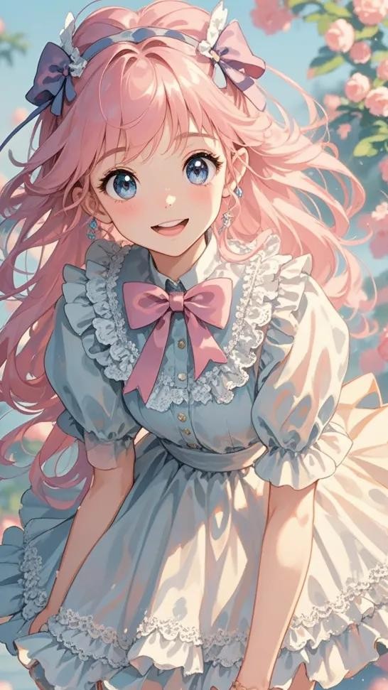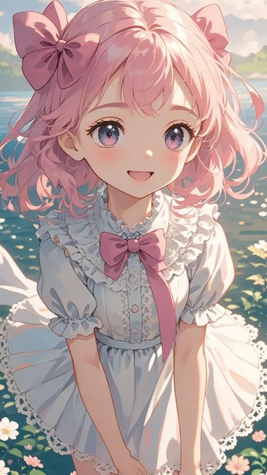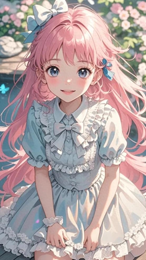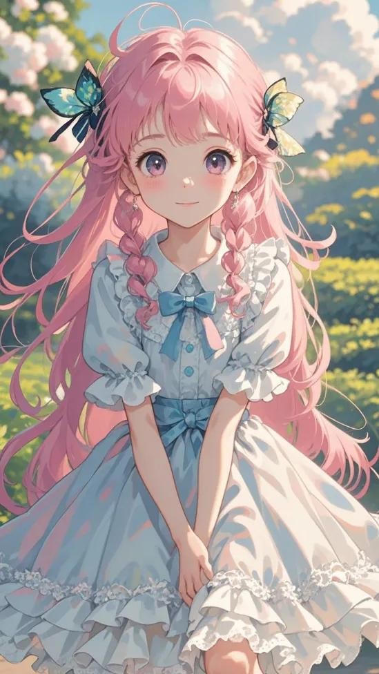 ** 细节: 粉色长发,发饰上点缀着小巧的蝴蝶结,穿着精致的蕾丝裙装,裙摆轻盈飘动