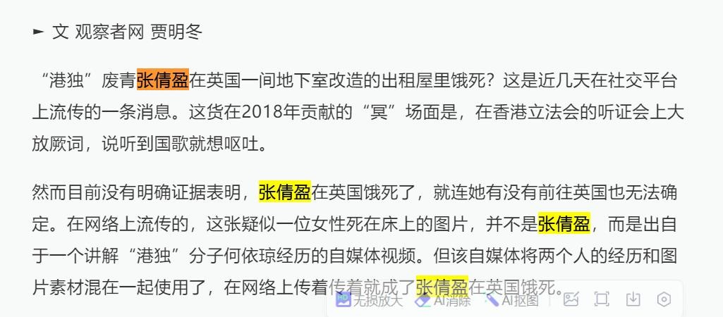 "港独"废青张倩盈在英国饿死?事情未必真 观察者