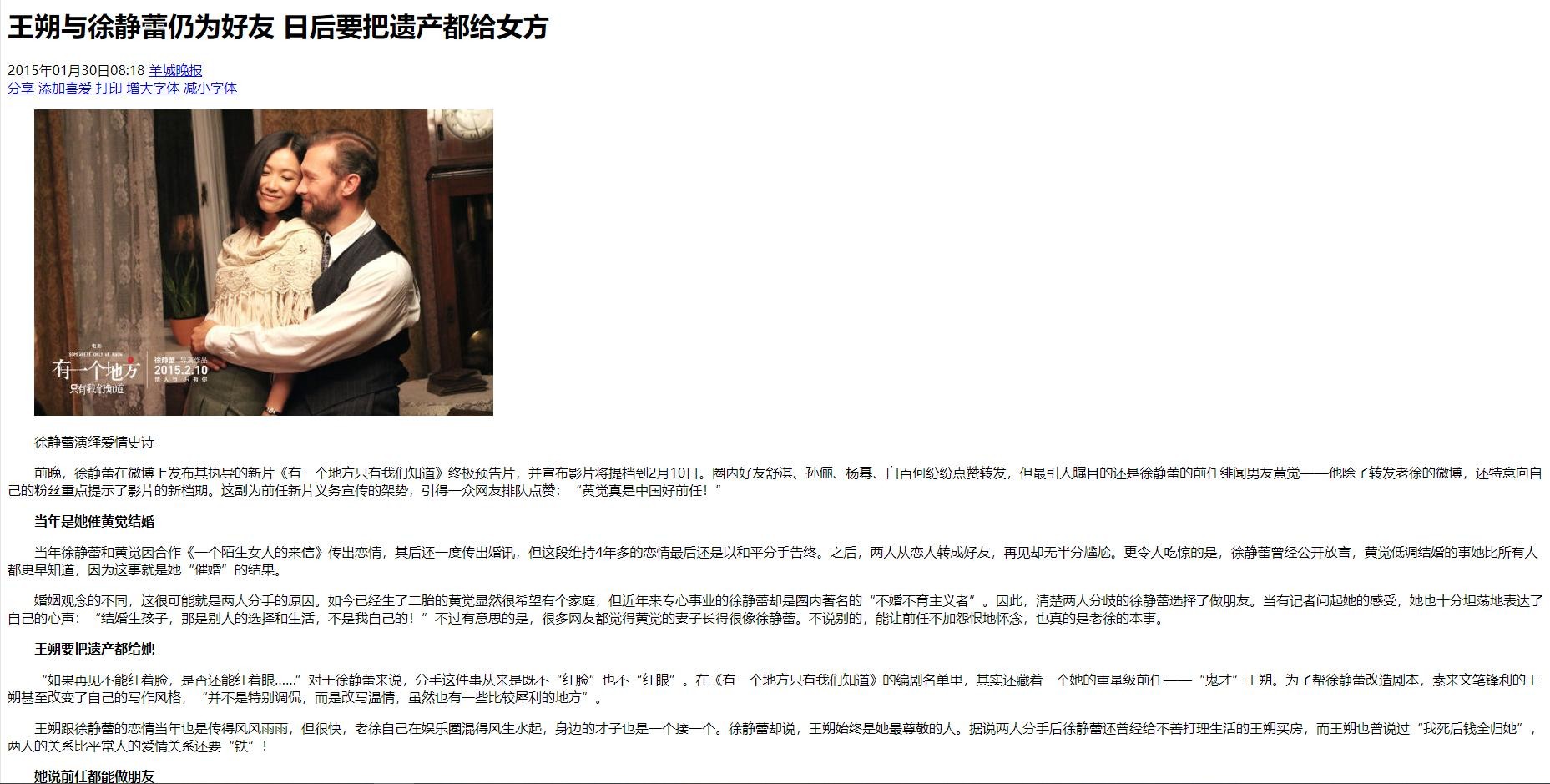 王朔与徐静蕾仍为好友 日后要把遗产都给女方 2015年01月30日08:18 羊城晚报