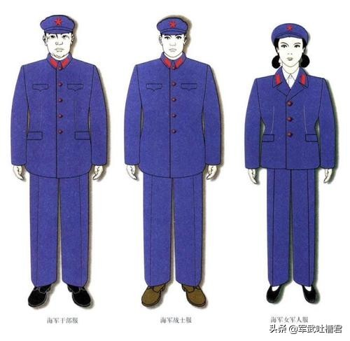 与之前的军服不同,在颜色上除了之前的藏青色、白色和蓝色之外,我国的55式军服还运用了天蓝色。比如水兵帽帽墙的披肩领和袖头上就采用了天蓝色。