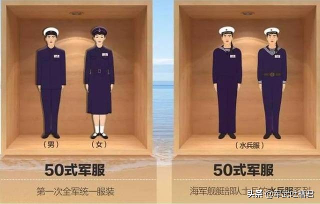 1950年1月4日,海军军服又有了新的变化,军服设计者们参考辛亥革命以来的中国海军军服以及其它国家的海军军服,设计出了我国历史上非常著名的50式军服。后来,这套新的海军军服样式幸运地得到了中央军委的正式批准。