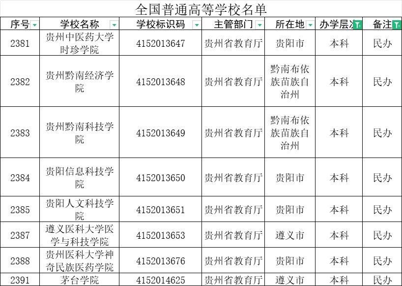 1.本科学校(29所):其中,本科院校又分为985/211/双一流学校(1所),普通公办本科学校(20所),民办本科&独立学院(8所),贵州一共有6个地级市和3个自治州,属于典型的单教育中心,教育资源相对比较集中。具体高校如下分布: