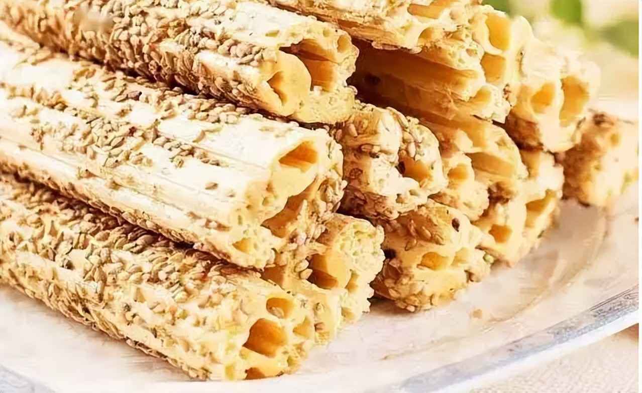 在多个细孔的挤压下,糖稀组织变得疏松,成品因此格外酥脆。将做孔完毕的糖稀条拉成手指粗细,长约10米的长条状。