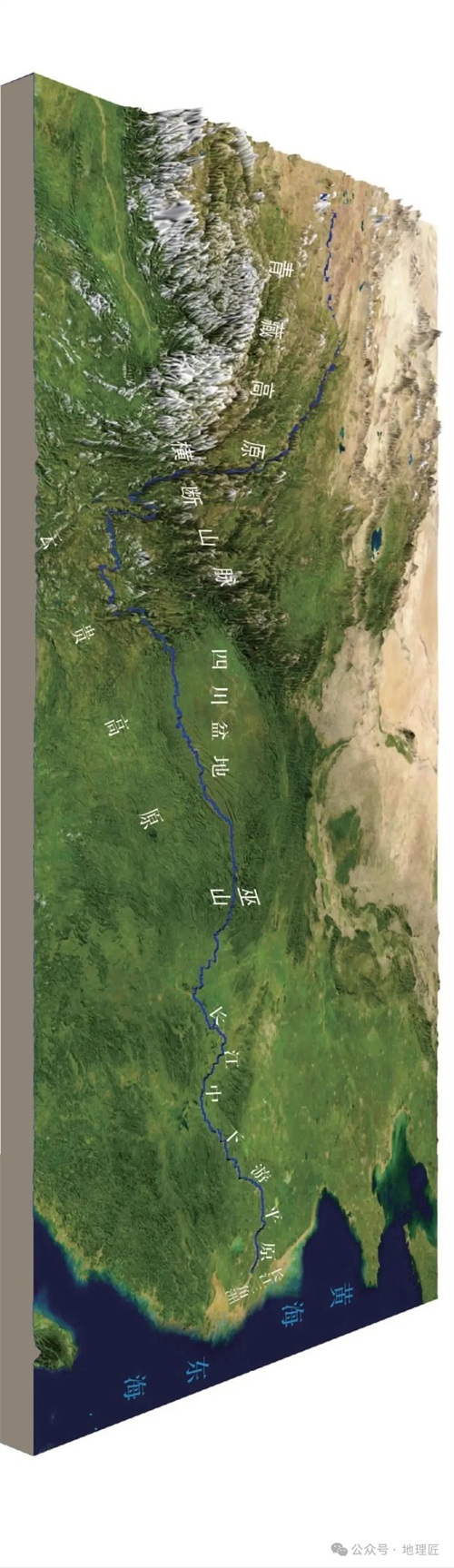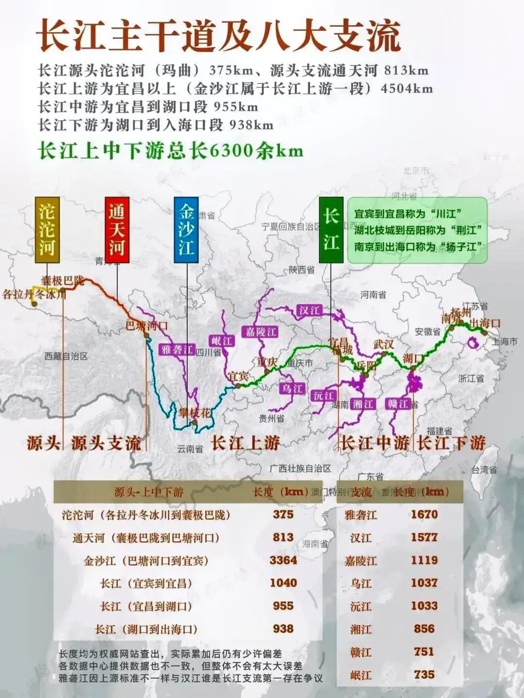 长江,全长6300多公里,世界第三长河,仅次于尼罗河以及亚马逊河,发源于唐古拉山脉的各拉丹冬峰,经青藏高原、横断山脉、云贵高原、四川盆地、巫山山脉、长江中下游平原,最终汇入东海。
