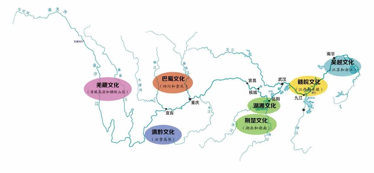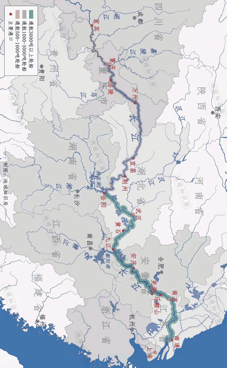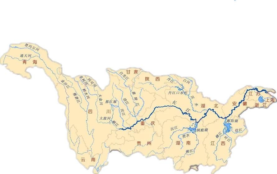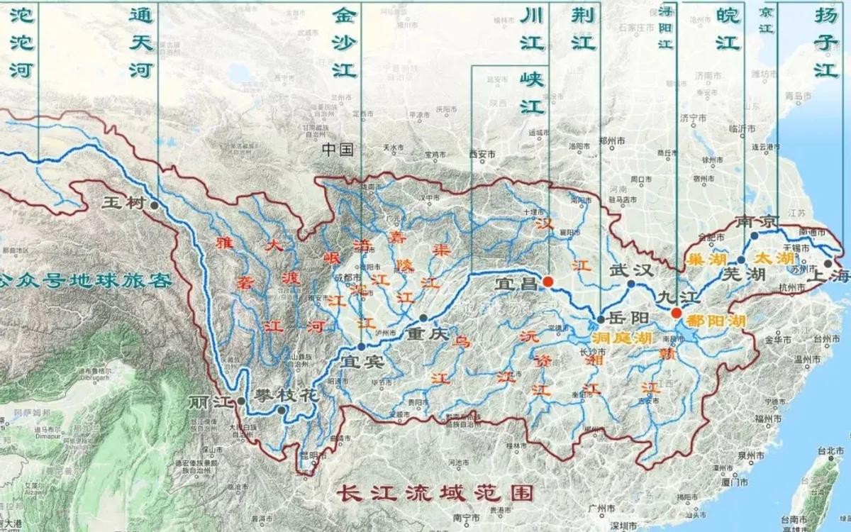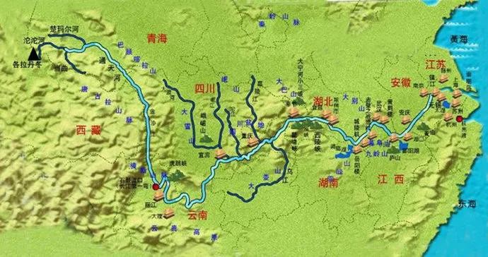 图24,长江在各航段的命名(沱沱河、通天河、金沙江、川江、峡江、荆江、浔阳江、皖江、扬子江)