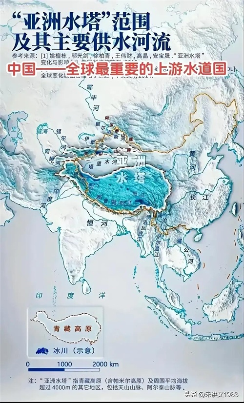 图23,亚洲水塔示意图,黄河、长江、雅鲁藏布江、恒河、印度河、澜沧江、怒江、伊洛瓦底江、阿姆河、塔里木河等等都是发源于青藏高原。