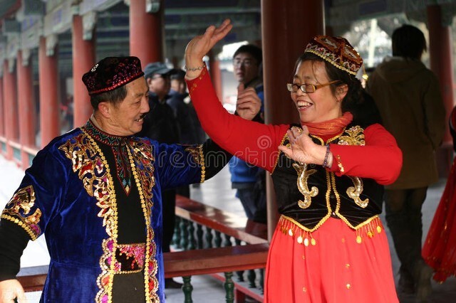 维吾尔族的大爷大妈一起欢乐舞蹈