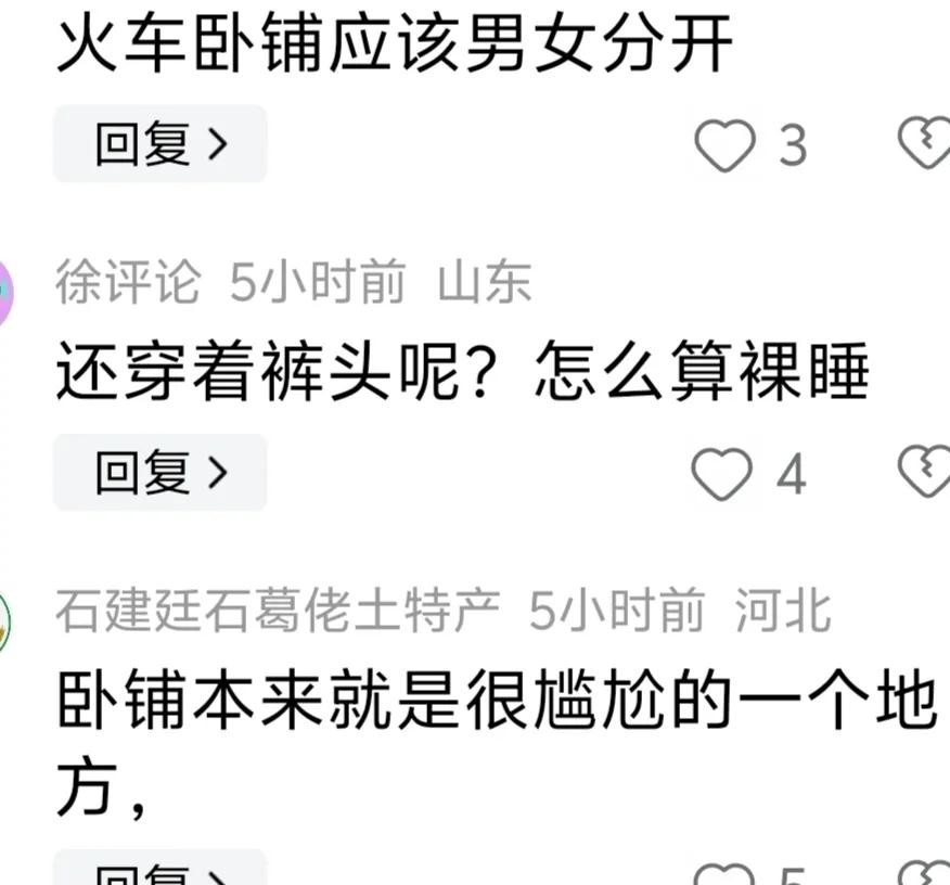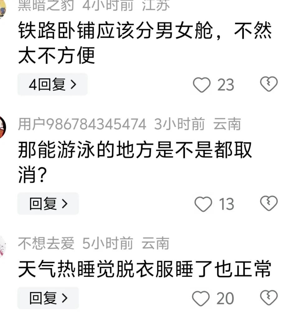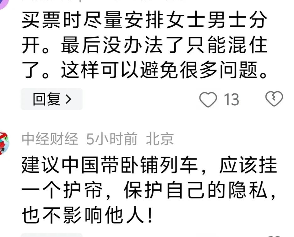 郭女士的经历引发了网友的广泛讨论,尤其是关于是否应该在卧铺车厢实施性别隔离的措施。一些网友认为,男女分开的卧铺可以更好地保护女性乘客的安全与隐私,特别是在夜间长途旅行中。同时,也有网友指出,这样的措施可能会带来操作上的不便和管理成本的增加。