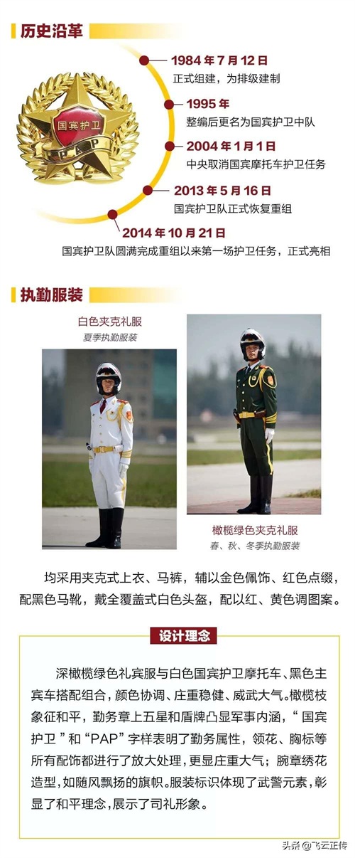 为体现国家礼仪,展示大国形象,2013年4月初,按照习主席的指示精神,国宾护卫队重新组建,重塑光荣。