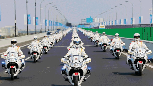 2016年9月4日14时30分,杭州。在欢迎各国元首参加G20峰会到访的仪式上,身穿洁白礼服、胸佩金黄绥带、脚蹬乌黑马靴的武警官兵动作整齐划一,驾驶着白色摩托车呈“V”字队形,护卫着国宾车队前进。