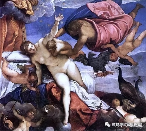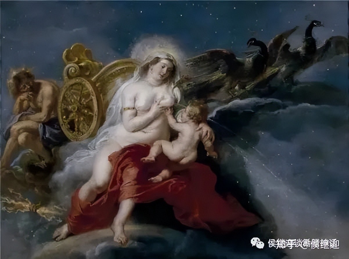 鲁本斯这幅画中的赫拉与阿尔喀得斯看起来倒像是一对母子,躲在孔雀车后面的宙斯将霹雳火电棒扔在地上,一副十分猥琐的样子。