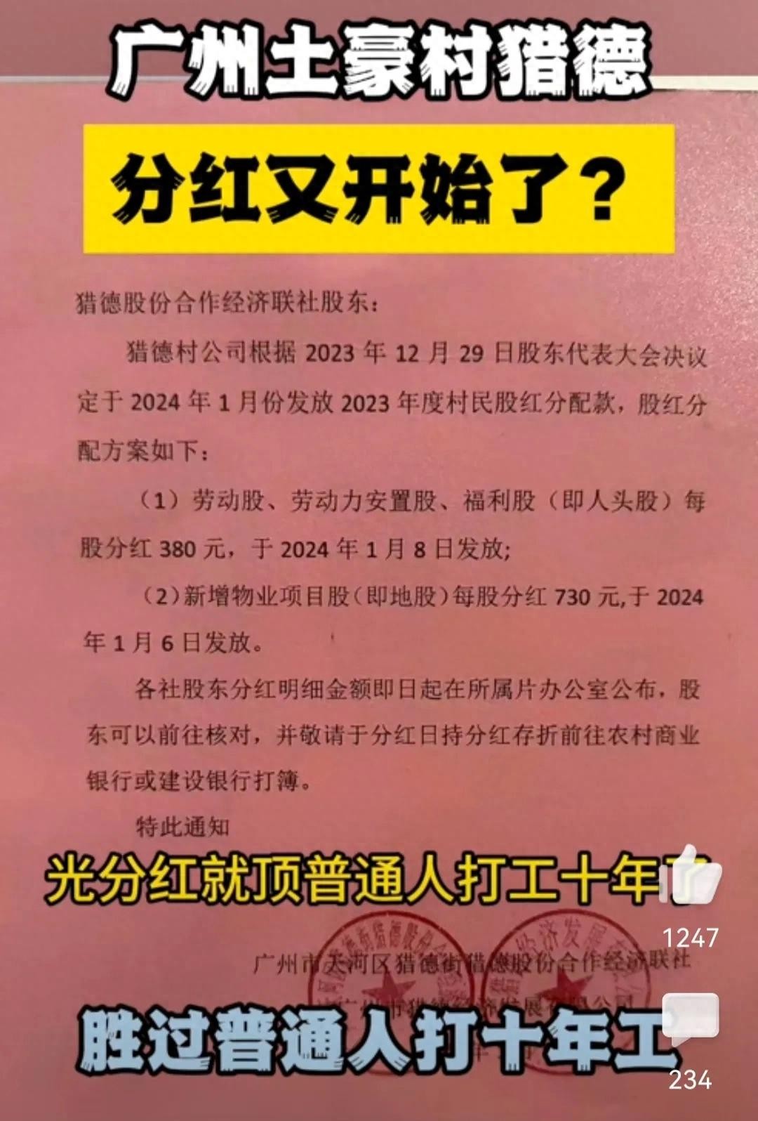 后续!广东猎德村年底分红,每股最高1110元,有村民分发金额泄露
