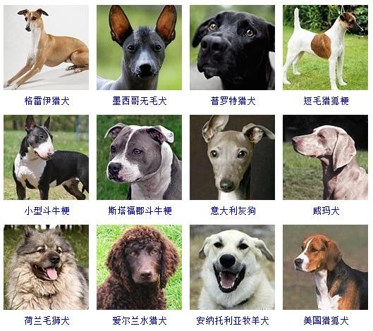 9、格雷伊猎犬、墨西哥无毛犬、普罗特猎犬、短毛猎狐梗、小型斗牛梗、斯塔福郡斗牛梗、意大利灰狗、威玛犬、荷兰毛狮犬、爱尔兰水猎犬、安纳托利亚牧羊犬、美国猎狐犬等;