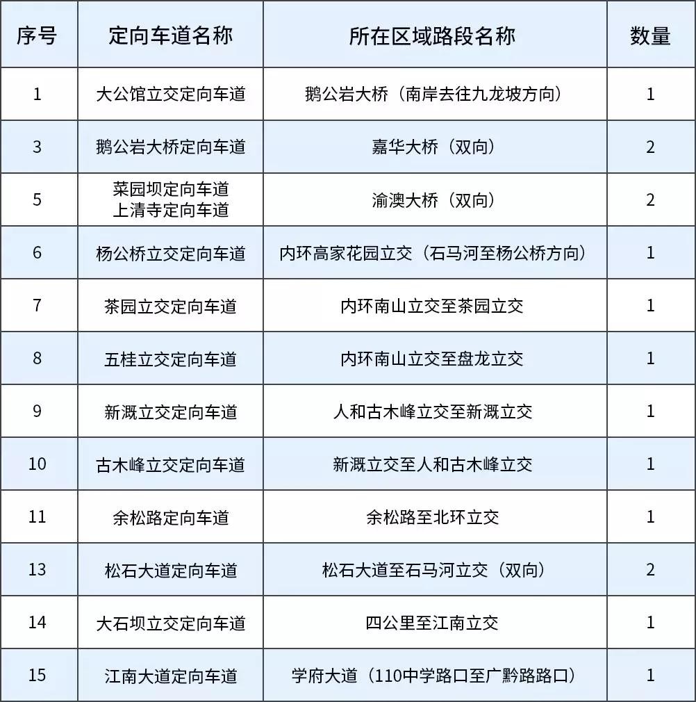 根据群众的建议,结合各区域位置的特殊情况,重庆交巡警已在内环高家花园大桥、民安大道、江南立交等地新建了12处定向车道,在工作日高峰时段,车辆平均时速由23km/h提高至27km/h,速度提升15%左右,设在内环的定向车道高峰时速可达52km/h。