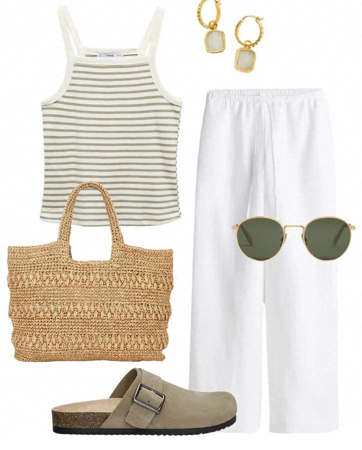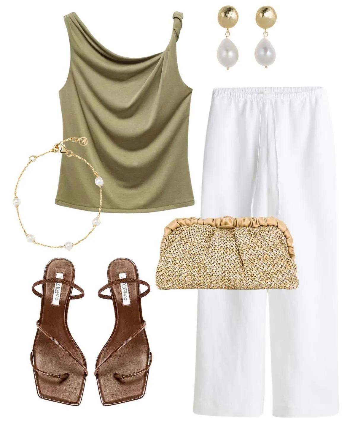 让白色裤子增加洋气感,哪怕是一件绸缎面料背心,用抹茶绿衬托丝绸面料的光泽感,再点缀珍珠耳坠和手链,用草编手拿包营造慵懒意味,悠然的夏日感依然能穿出来。