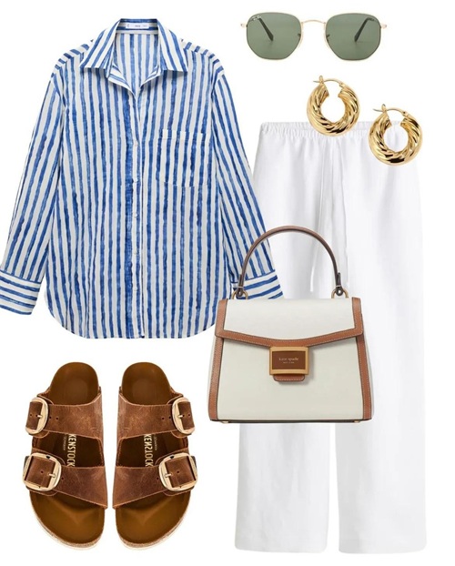 最后则是印染感的蓝条纹衬衫,与白色裤子搭出海洋感的清爽风,保持成熟大方之外又不失减龄,用基本款穿出适合普通人的时尚感吧。