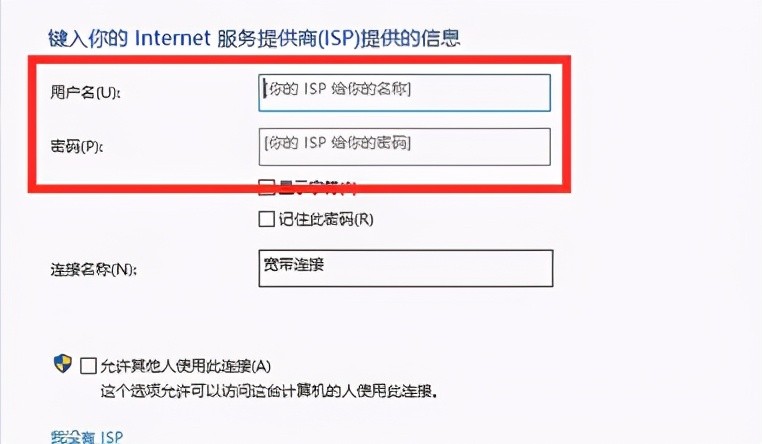 6、“用户名”中输入宽带账号,“密码”中输入宽带密码,点击“连接”