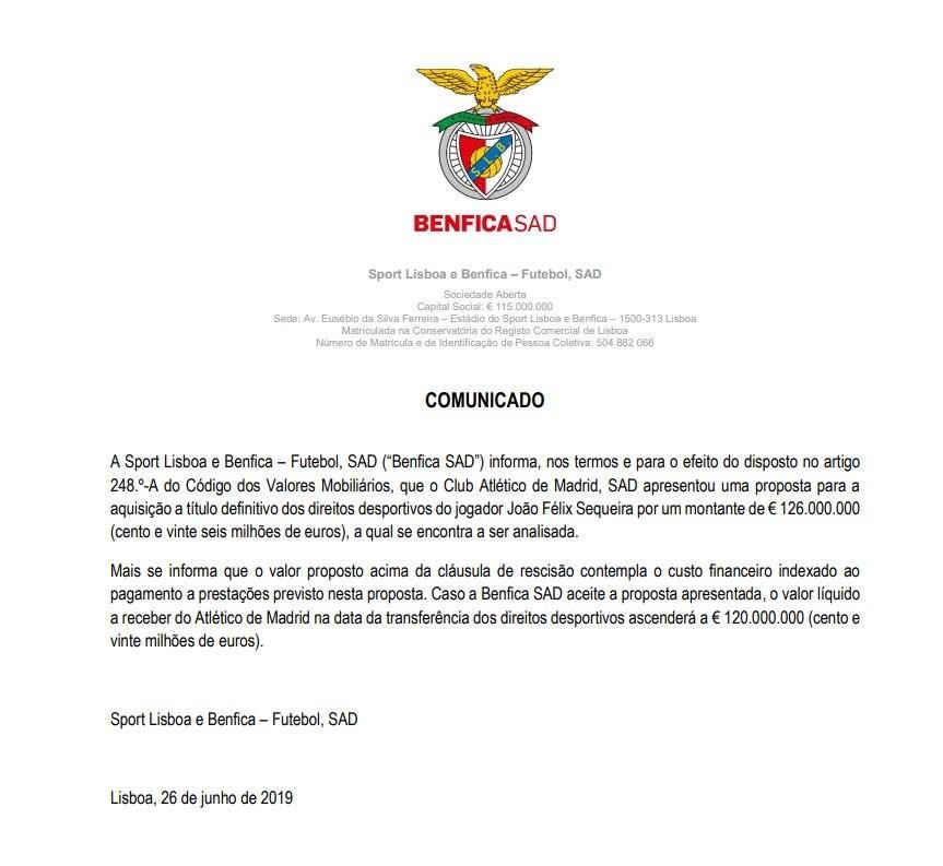 2019年06月27日,马德里竞技官方宣布以1.26亿欧元的价格签下菲利克斯,7月4号菲利克斯正式加盟。签约了7个赛季,身披7号球衣。菲利克斯也超越了C罗,成为了转会费最高的葡萄牙人!