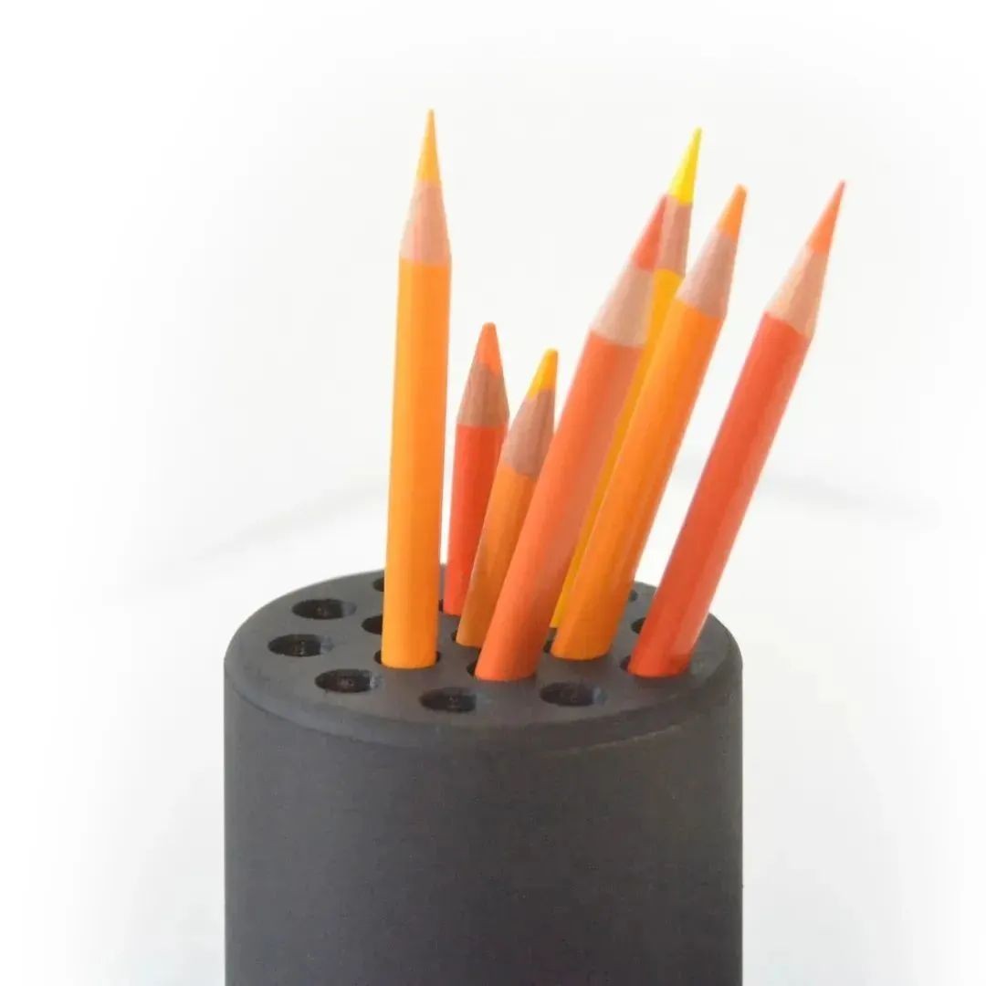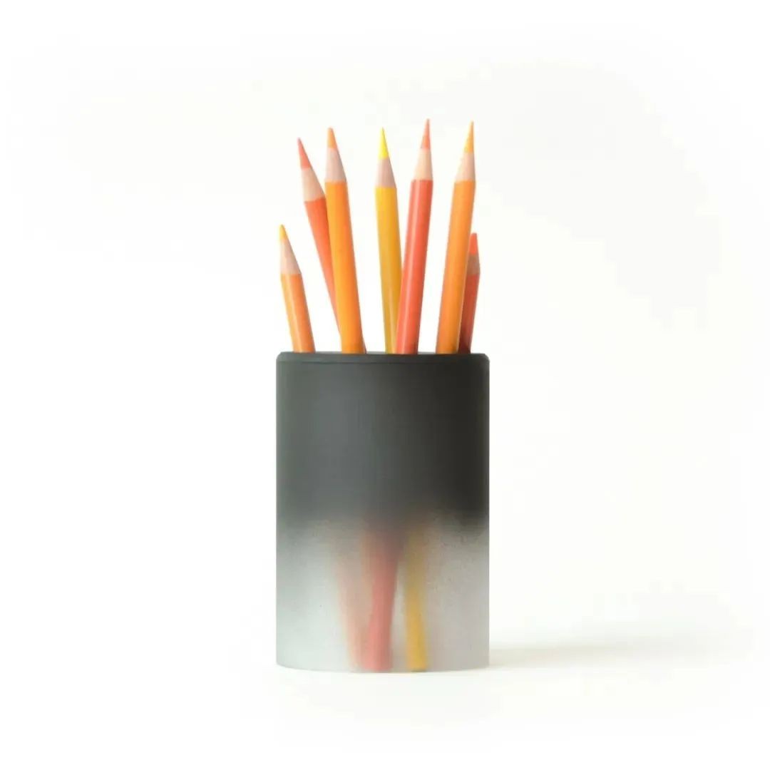 这款笔筒的设计灵感来源于“煤球”,铅笔锋利的形状和艳丽的色彩看起来就像燃烧的烈火。笔筒的透明渐变隐喻地传达了一种牺牲地信息,它消失在灰烬中并在里面燃烧。