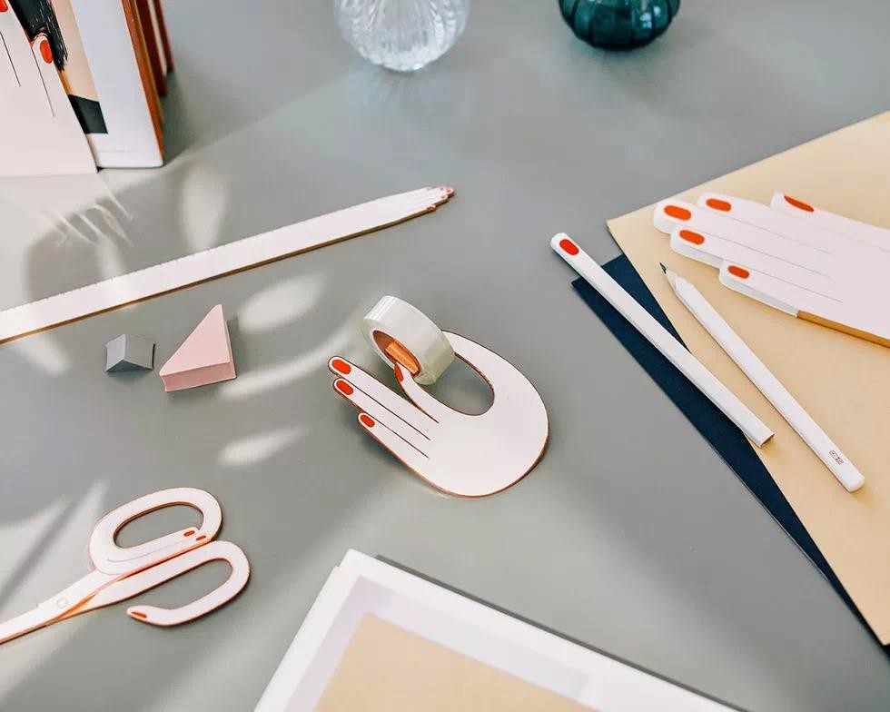 Handy系列文具以手为灵感,该系列包括剪刀、尺、铅笔、笔记本、书挡以及胶带盒等文具。手上还涂了指甲油,真的是可爱到想吃手手!