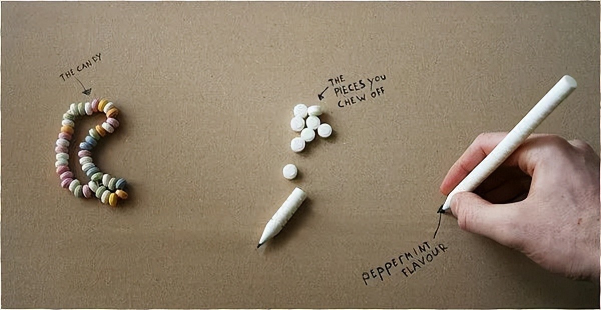 百分之八十的同学都有过“咬笔头”的坏习惯吧!设计师将笔杆换成了能吃的糖果,除了笔尖部分,整个笔身都由糖果组成,还有多种口味和颜色选择。手握这样一支糖果笔,在书写思考时可随时啃下一截来解解馋。