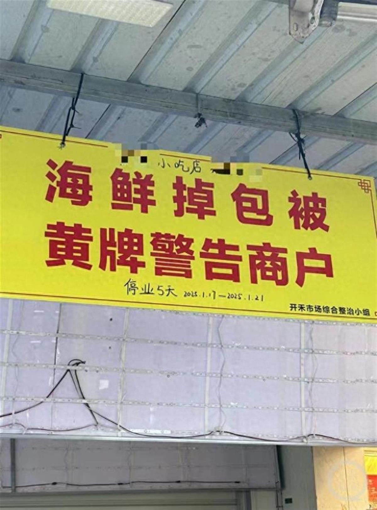 近日,有网友在社交平台发帖表示,自己在厦门开禾市场看到,某商家因“海鲜掉包”被处以停业5天的处罚,门口还被挂上了一块巨大的黄牌,上面写着“海鲜掉包被黄牌警告商户”,这样的处理方式赢得网友集体点赞支持。