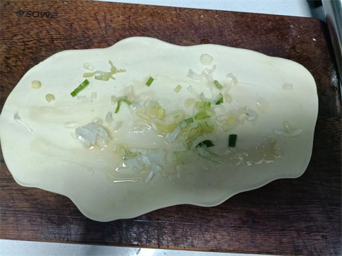 将醒好的面,用擀面杖摊开,然后再上面放入一定的小料,再撒点葱花,我一般喜欢再放点食用盐。