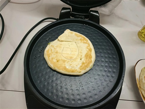 先在电饼铛里面涂去适量的食用油,然后加热,待预热后,将擀好的葱油饼放入电饼铛中,选择葱油饼。(每个电饼铛都不一样,你只要能加热,看到饼变色,外面酥脆即可)。喜欢吃脆的可以多烙一会。