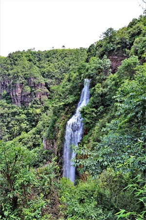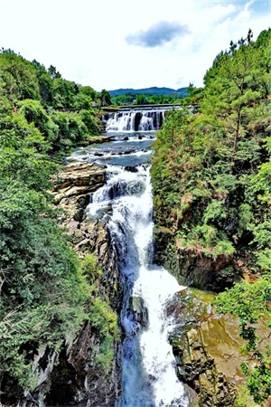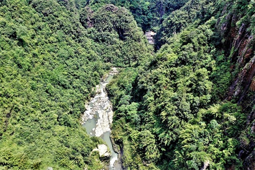 大峡谷的顶端状似一只大埕,谷面宽约600米。平静的大布河流从东南向西北蜿蜒流过,从谷口梯级状的崖顶飞流直下,形成气势磅礴、撼人心魄的大瀑布,落差达200多米,应该算广东第一大瀑布,这个落差在国内大瀑布中也排得上号。