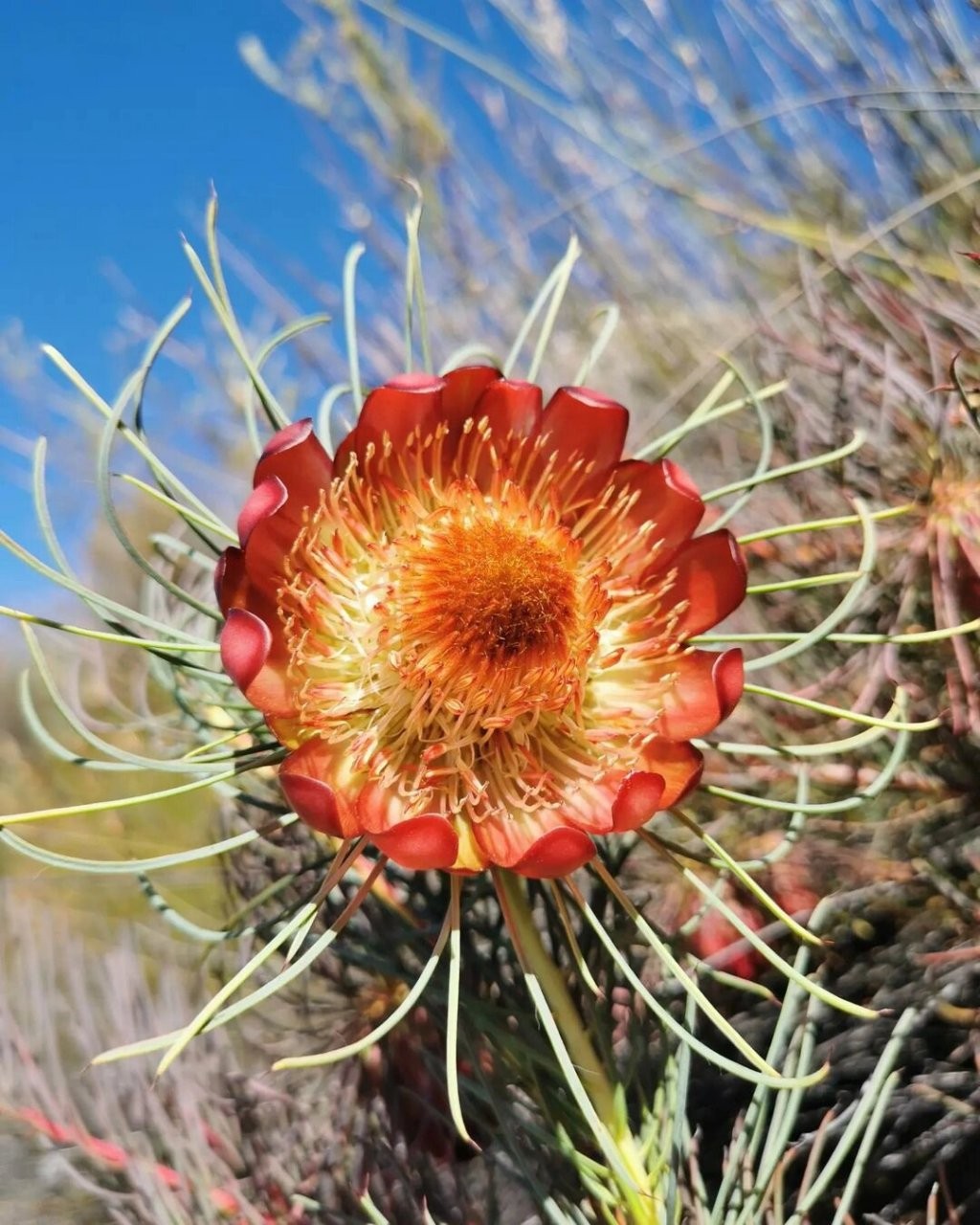 巨型花球直径可达30厘米,雌花如帝王冠冕,雄花似权杖,被誉为“花中之王”。其生命周期达百年,见证南非的殖民与新生。