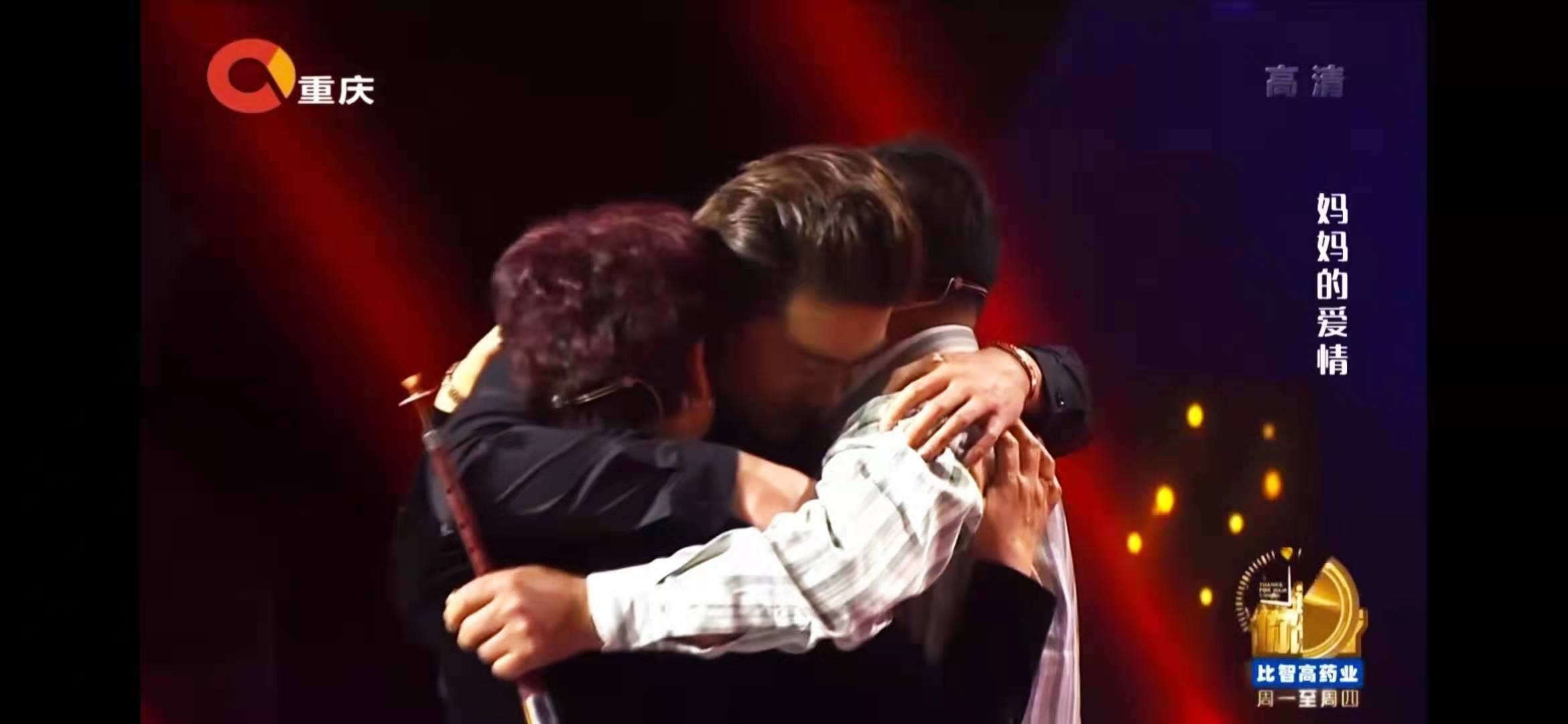 一家人激动地紧紧拥抱在一起。全场人泪奔。