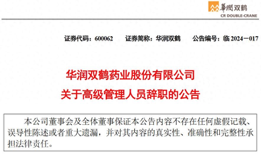 韩朔辞去华润双鹤药业股份有限公司副总裁职务