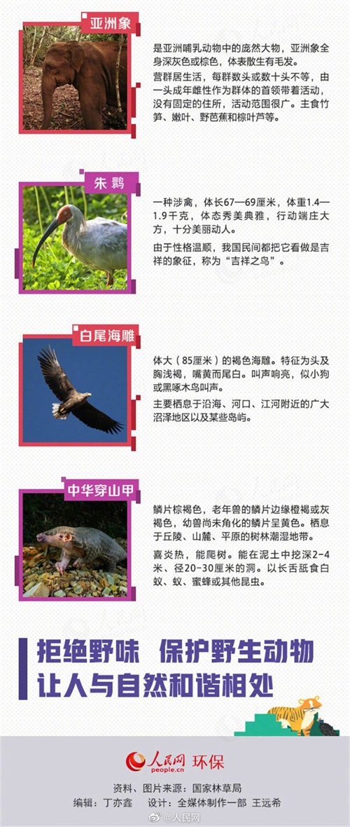【介绍一下:这几位是国家一级保护动物】保护野生动植物,实质上就是保护人类赖以生存的生态环境,就是保护人类的的家园。今天带你认识国家一级保护动物。欢迎第1期主角登场:大熊猫、川金丝猴、雪豹、东北虎、亚洲象、朱鹮、白尾海雕、中华穿山甲。(人民网环保频道)