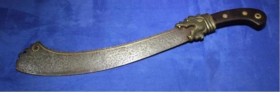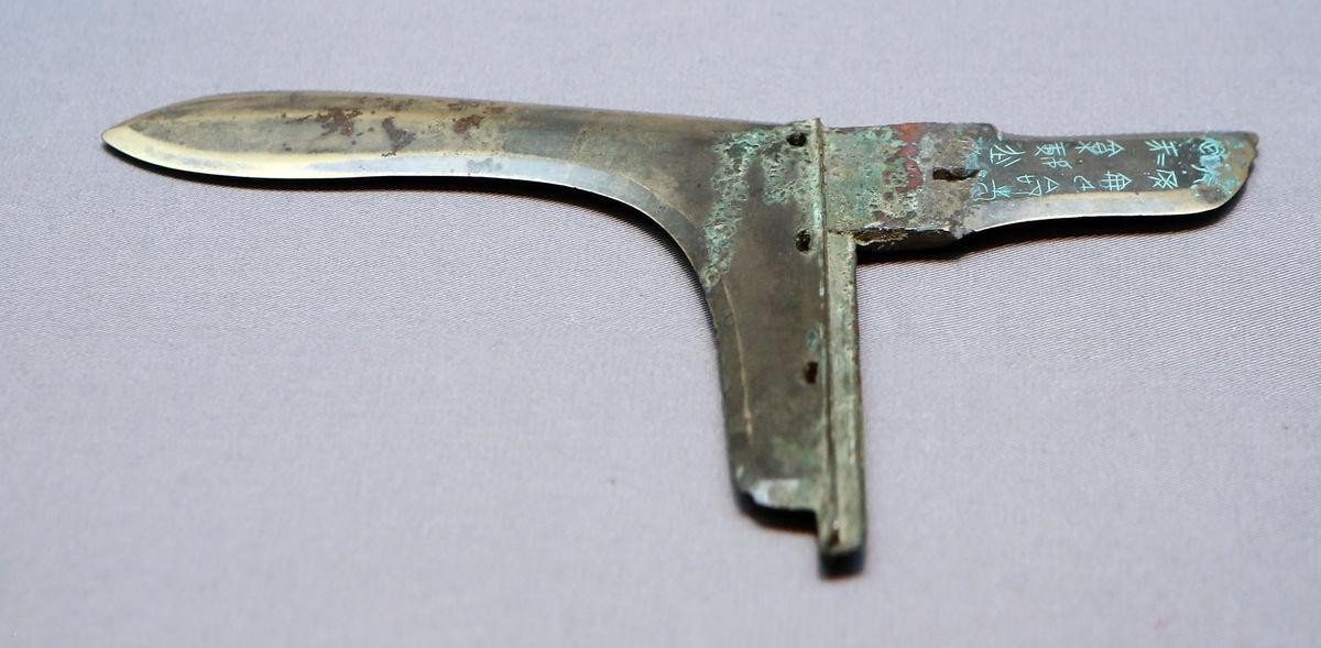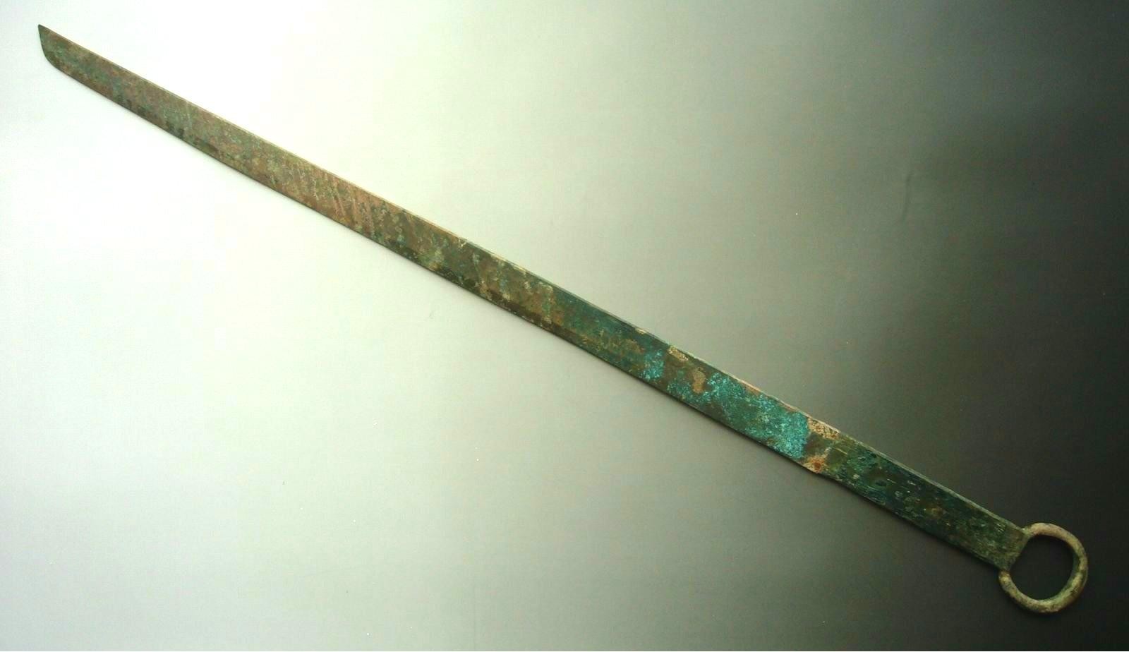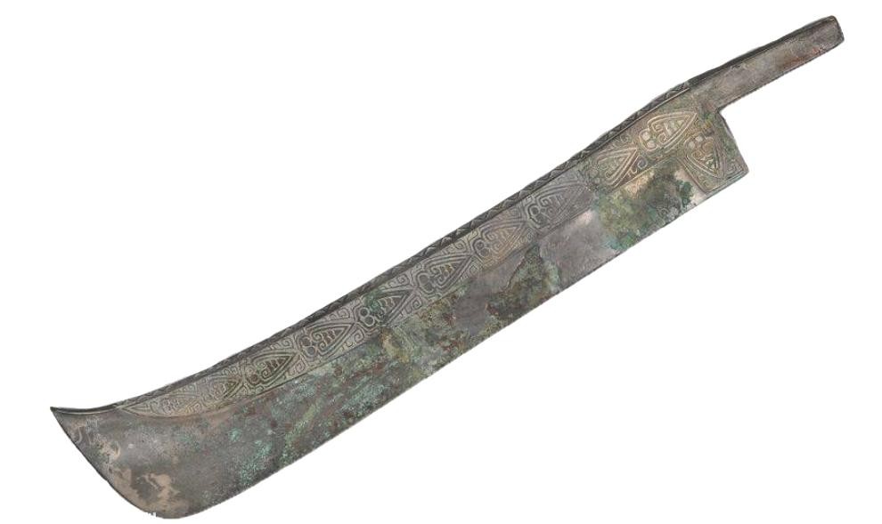 商代的青铜大刀,刀身较宽、刀尖翘起,可供作战用。