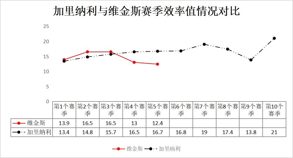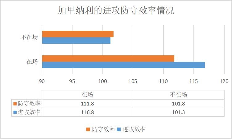 通过分析加里纳利在场和不在场情况下的进攻防守效率,加里纳利是一名“双刃剑”球员。当加里纳利在场时,球队的防守效率为111.8,进攻效率为116.8;当加里纳利不在场时,球队的防守效率为101.8,进攻效率为101.3。显然,加里纳利能够很大程度提高球队进攻能力,但糟糕的防守也导致球队过多的失分。