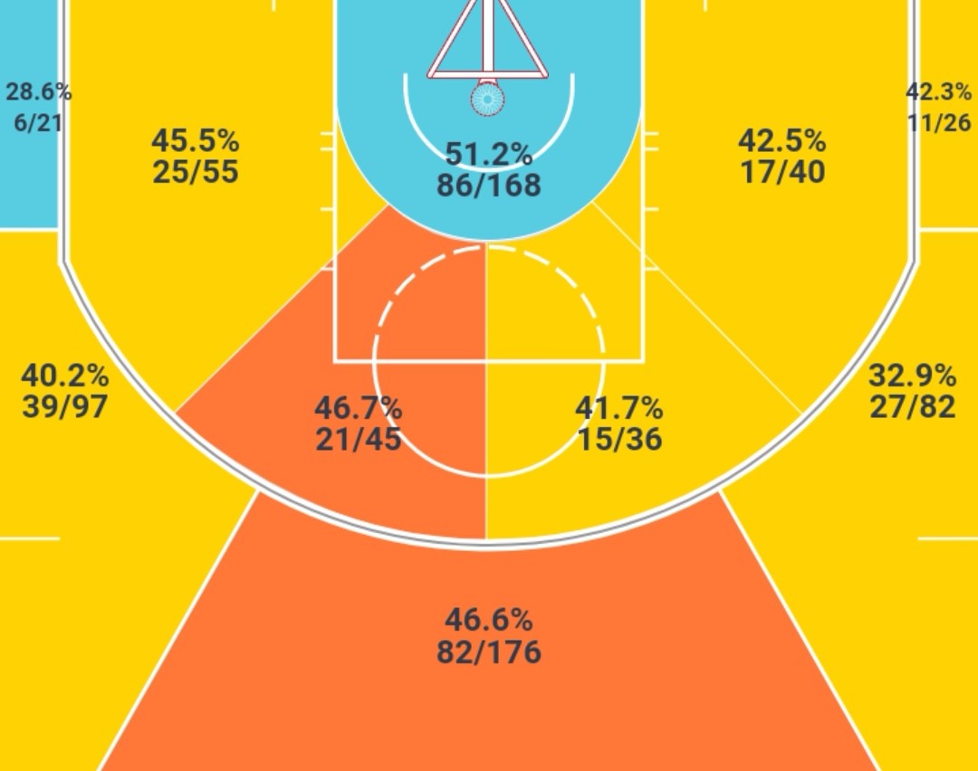 纵观2018-2019赛季以及2019-2020赛季的投篮热图,左侧底角是加里纳利的死区,并且很少会选择出手。在2018-2019赛季,加里纳利的右侧中投区域的命中率低于联盟平均水平,仅为33%左右;然而,外线三分却拥有非常高的命中率,左翼区域高达50%,中间区域为42%。