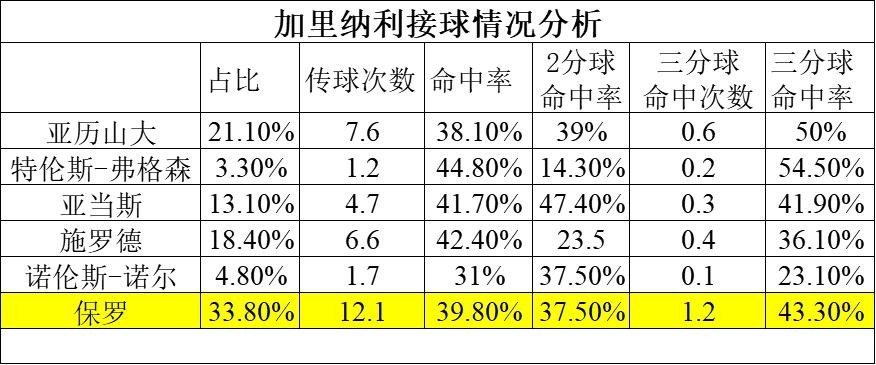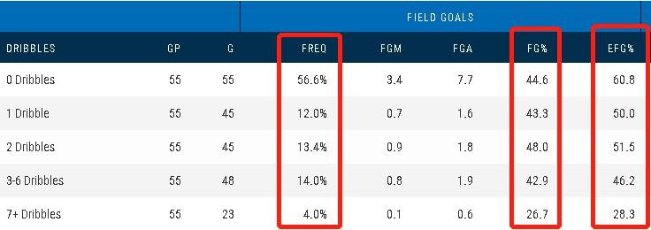 通过进攻方式的分析可以知道,加里纳利的接球投主要为三分球,并且接球投的三分球命中率高达42.3%。在持球进攻方面,加里纳利也保持了场均1.4个三分球出手,但命中率仅为35.1%,远不如接球投。同时,在少于10英尺的进攻依然占比23.2%,说明加里纳利依然保持的一定比例的持球突破冲击内线的进攻,并且命中率为49.4%。