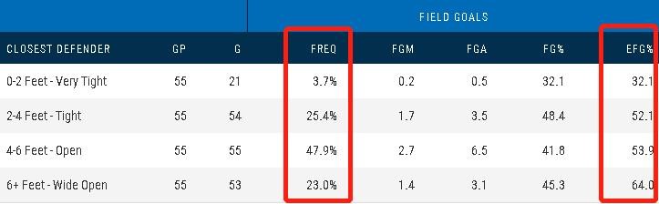 不同于哈登等人的投篮,加里纳利在雷霆的定位是“无球跑动”的三分投手;因此,加里纳利大多数情况下都是空位投篮。加里纳利面临0-2英尺防守的投篮占比仅为3.7%,面临2-4英尺防守的投篮占比25.4%,面临4-6英尺防守的投篮占比47.9%,面临6英尺+防守的投篮占比23%;同时,加里纳利在一定防守强度下的投篮命中率反而更高。