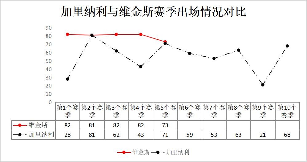 从先天条件和本身的技术特点来看,加里纳利都是一名全明星级别的球员。然而,加里纳利却拥有很多天赋球员都具备的克星,那就是“玻璃人属性”。同是小前锋,维金斯就保持着非常不错的“枸杞”属性,基本每个赛季都是全勤;然而,加里纳利却在第4个赛季和第9个赛季经历了大伤,出场次数不足50次,并且其他赛季也受伤病影响,出场次数不足60场+。此外,虽然出场时间少,但是加里纳利的效率值(PER)总体比维金斯高。在2K20的能力值排名中,加里纳利以84分位列第七,高于英格拉姆和塔图姆。